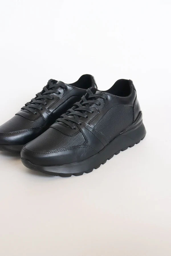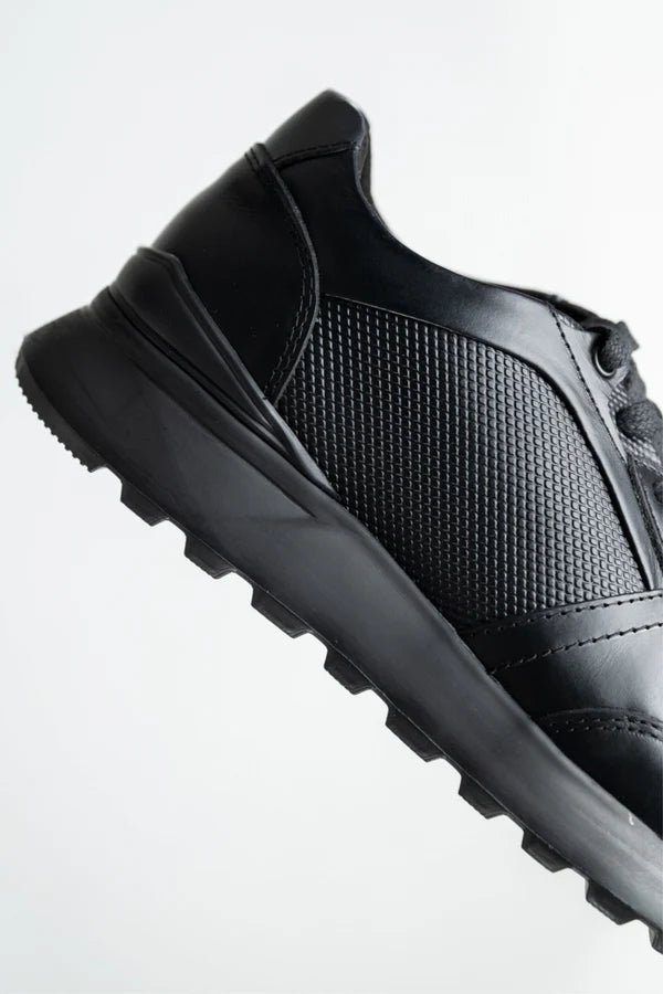 These all-black sneakers blend athletic edge with casual elegance, crafted in full leather with a textured panel for added dimension. The rugged sole provides stability and a modern twist, while the sleek black-on-black design makes them perfect for everyday use or business-casual outfits. Style them with fitted jeans, joggers, or even chinos to elevate your comfort without compromising your look.