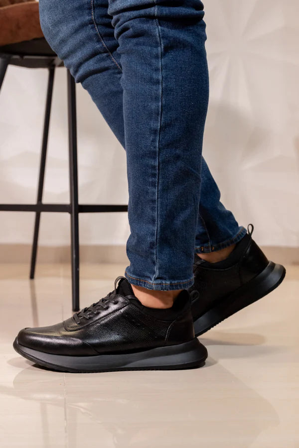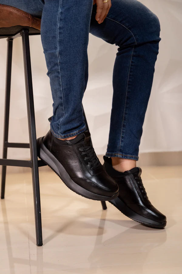 These sleek black leather sneakers are made for men who value comfort and clean style. With a low-profile silhouette and smooth finish, they easily transition from weekday errands to weekend hangouts without compromising on elegance or functionality.