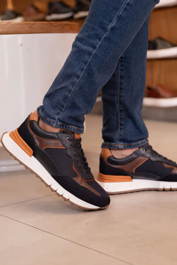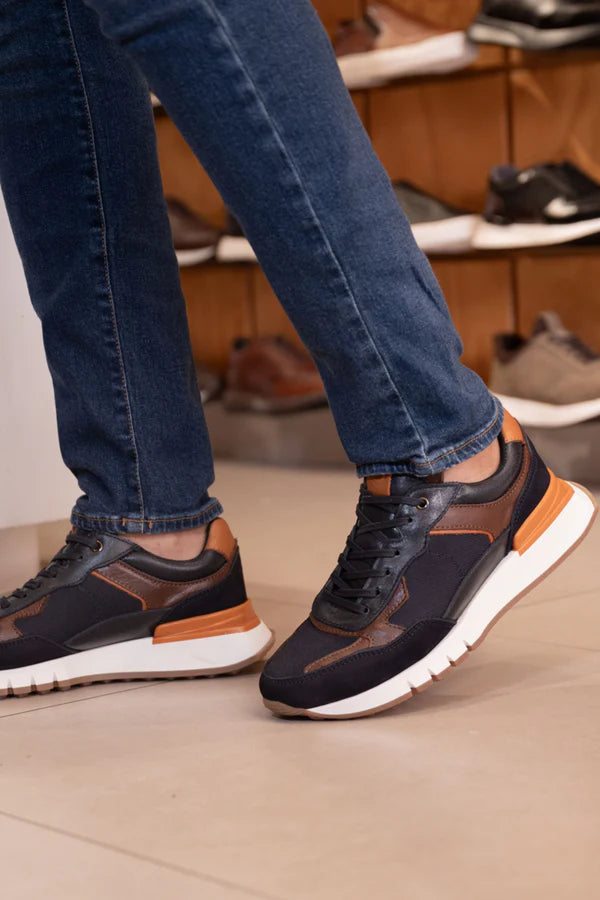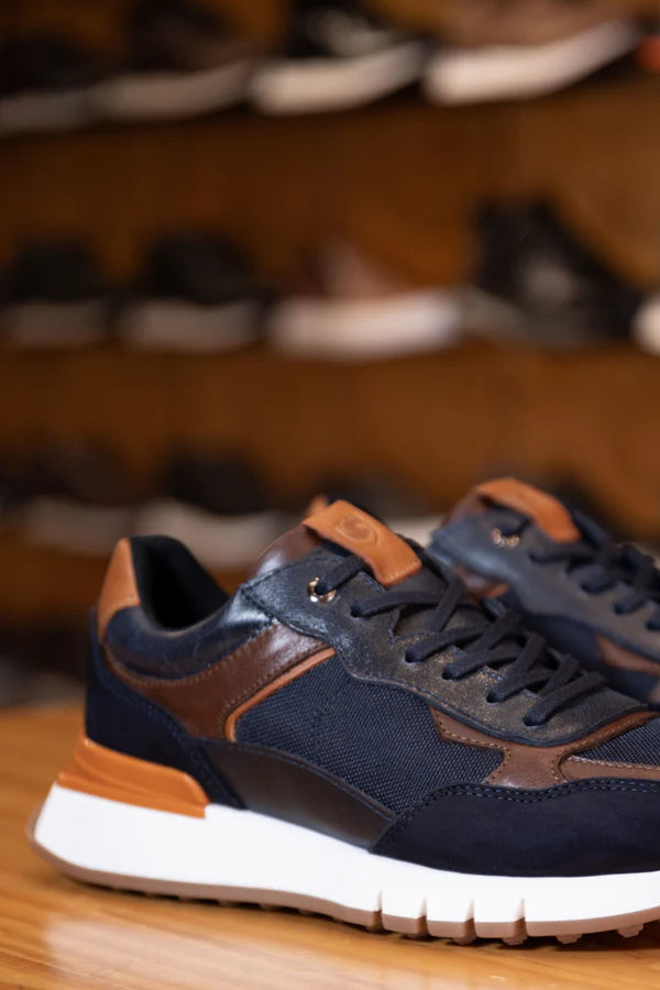 Designed for movement and modern life, these navy and tan leather sneakers combine sporty energy with urban refinement. Their cushioned sole offers support for all-day wear, while the color-blocked panels and mixed textures add standout appeal to any outfit.