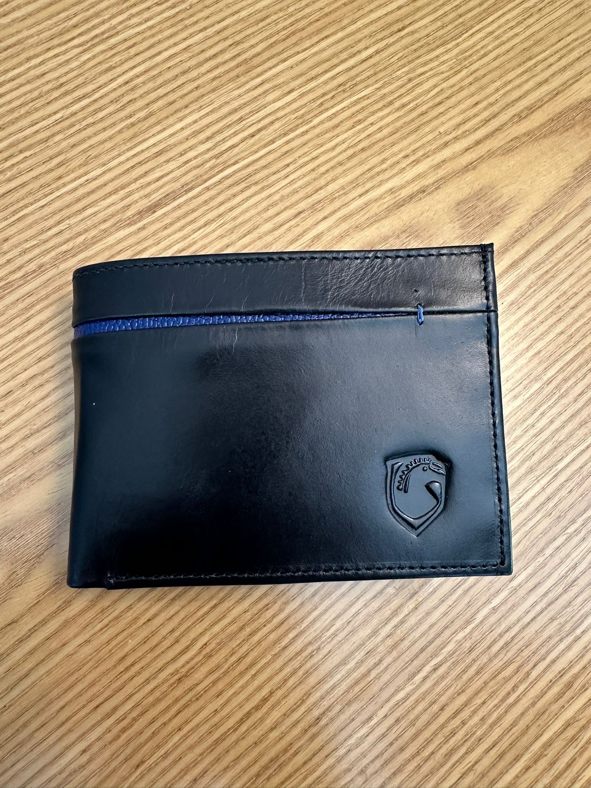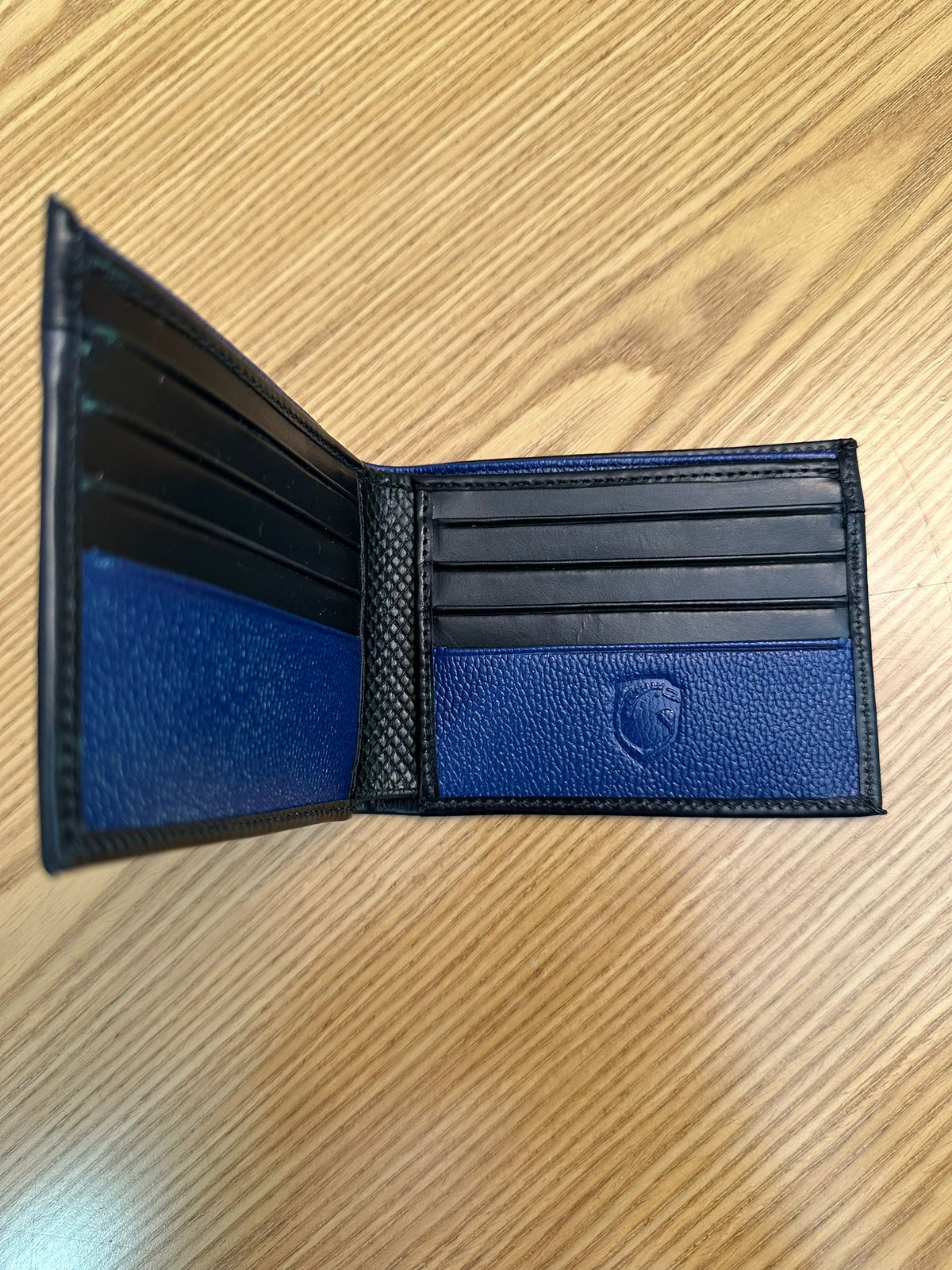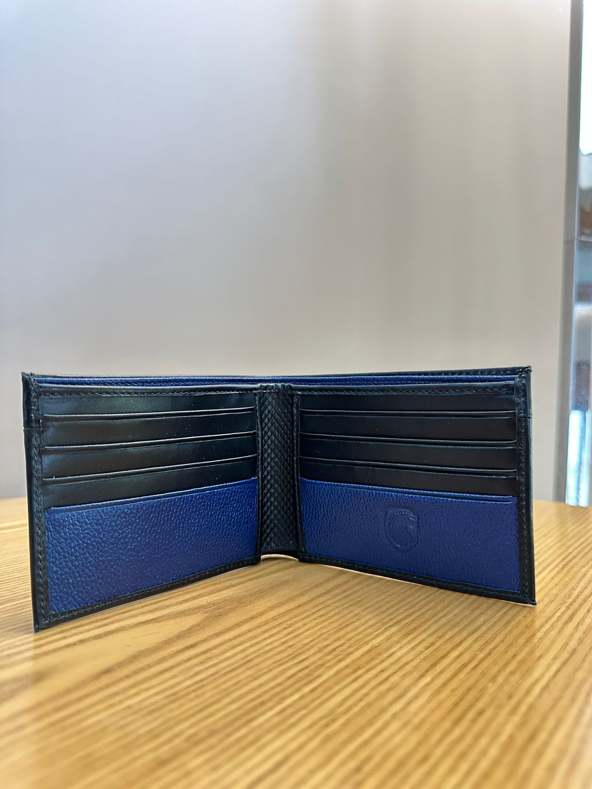 This elegant black wallet features deep blue interior details for a subtle yet impactful statement. With fine leather texture and precise stitching, it combines classic design with a modern color contrast for a refined everyday carry.